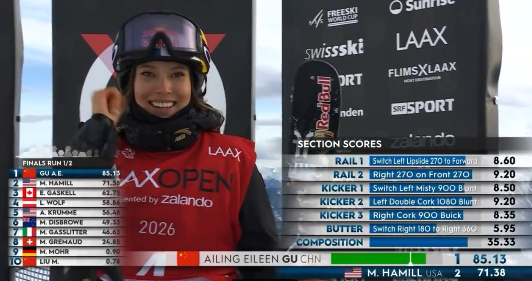 北京时间1月17日晚,2025-26赛季自由式滑雪世界杯瑞士莱克斯站女子坡面障碍技巧决赛,谷爱凌以85.13分获得冠军。这是她本赛季首个坡面障碍技巧的冠军,也是其个人的第20个世界杯冠军。另一名中国选手刘梦婷排名第十。
