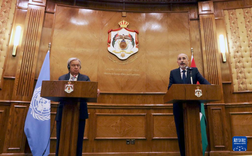 3月25日,在约旦首都安曼,联合国秘书长古特雷斯(左)与约旦外交大臣萨法迪召开联合新闻发布会。新华社发(穆罕默德·阿布·古什摄)