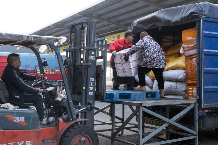2024年1月5日,在湖北省潜江市的中国小龙虾交易中心,工人正在进行搬运作业。新华社记者肖艺九摄