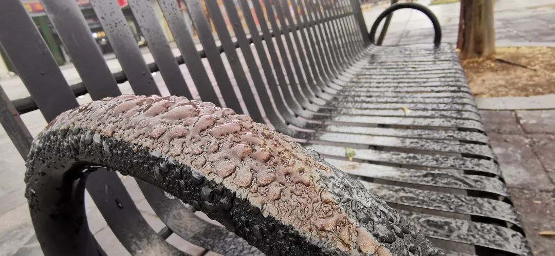 2月1日夜间,安徽省霍山县出现冻雨,路边的座椅表面冻结上一层薄冰。摄影:高琳