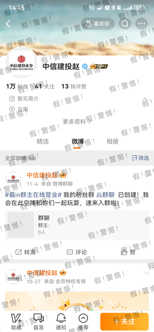 近期,中信建投证券股份有限公司(以下简称“我公司”)收到投资者反馈有不法分子冒用我公司名义通过微博网络平台进行虚假宣传,以开通所谓“专用通道”索要投资者身份证信息并发送假冒APP下载链接。我公司特别提醒广大投资者注意防范非法证券活动,以下是我公司近期发现的具体仿冒情况: