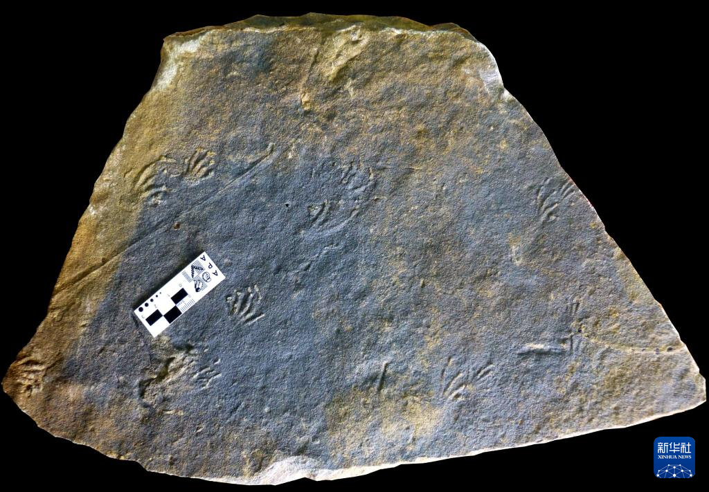 这是2017年5月研究人员在西班牙北部阿斯图里亚斯自治区拍摄的蜥蜴足迹岩板。新华社发(研究团队供图)
