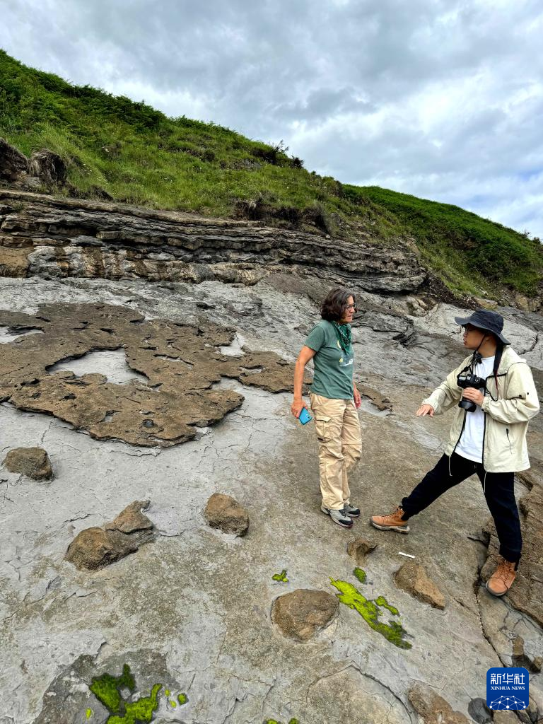 这是2024年7月中外学者在西班牙北部阿斯图里亚斯自治区考察化石遗迹。新华社发(研究团队供图)