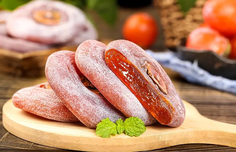 至于柿饼外面的白霜,并不是商家涂抹的防腐剂,而是柿子被晒成柿饼时,水分逐渐蒸发,果肉里所含的葡萄糖和果糖也会逐渐渗透到表皮上来,在表面凝结形成白色粉末,是可以放心吃的,无需刻意洗掉。