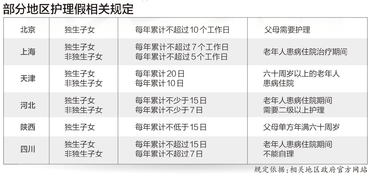 关于护理假究竟有何规定?记者梳理发现,尽管多个省市相继试水,但具体执行细则各不相同。