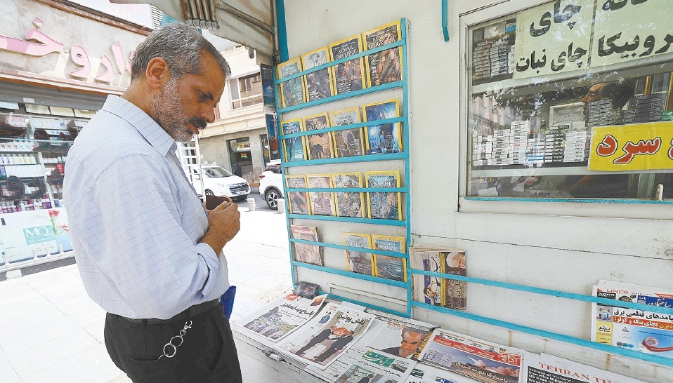 24日,一名德黑兰男子在报摊浏览报纸有关以伊冲突的报道。(视觉中国)