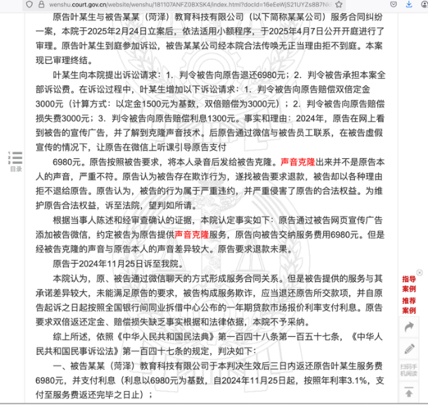 同时,记者在裁判文书网中查询到今年6月的一起民事案件,原告的诉求同样是克隆声音效果差,要求返还6980元的服务费。