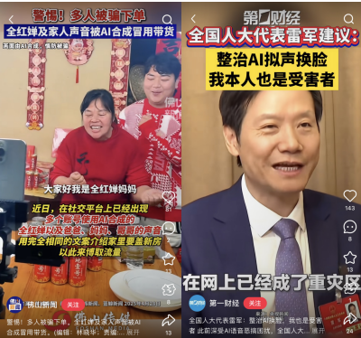 比如,新京报曾报道仅需几元可随意模仿明星声音,商家用AI克隆刘晓庆的声音悄悄带货。南方日报报道过全红婵及家人的声音被AI合成冒充带货,等等。