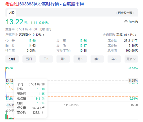 7月31日开盘,老百姓股价一度大跌9.91%,逼近跌停。