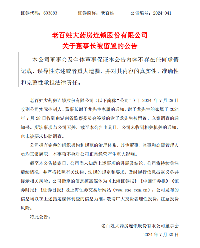 7月30日晚,上市连锁药房老百姓发布公告称,公司实际控制人、董事长谢子龙家属收到湖南省监察委员会签发的关于谢子龙被留置并立案调查的通知。