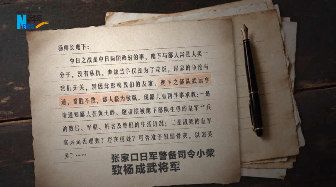 张家口日军警备司令小柴写给杨成武将军的信。图片截取自新华网短视频《黄土岭·神炮伏击震寇胆》
