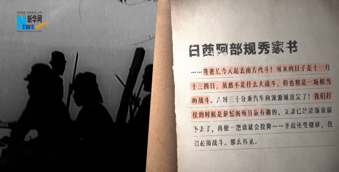 阿部规秀写给家人的信。图片截取自新华网短视频《黄土岭·神炮伏击震寇胆》