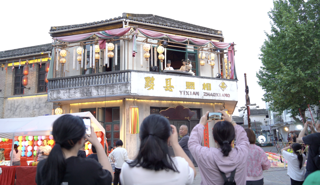 活动首创“一街多景”的时空叙事:城北漳河河面上《古黟有喜》宋婚巡游演绎东方美学;城内槐渠沿岸火锅香气氤氲升腾;古城中轴照相馆二楼的《伯乐之音》阳台音乐会则开辟出立体声场。乐手以古筝、竹笛即兴斗乐,悠扬乐声从百年建筑飘向青石板街,游客或驻足聆听,或登楼品茶观演,形成“人在景中听,乐在画中游”的文旅新场景。这种“建筑活化+音乐驻演”模式,为古城存量空间的功能焕新提供了实践样本。