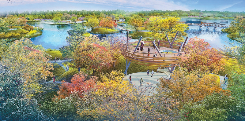在北区,以故宫博物院北院区为依托,以皇家园林文化为特色,设置岛中文苑景区,让游人感受文化气息。围绕核心的玉湖,设计云峰含润、水木余清、岩泉秋色、风月清华、玉湖天光、林树栖霞、青云旷远等景观,融合湿地泛舟、诗词长廊、国风研学、植物观赏等功能,并在青云旷远景观处设置融合传统与时尚的亭台,为游人提供登高望远之所。在南区,沿水系设计了登潭映月、水天朗彻、涧筑松涛等景观,增加互动提水装置、趣味水互动设施,以林间栈道加林下小溪盘活森林生境,让市民游客畅快体验多样亲水活动。这里还将打造小型“户外展览馆”,设置科普栈道,展示湿地、生境知识以及治水名人等内容。