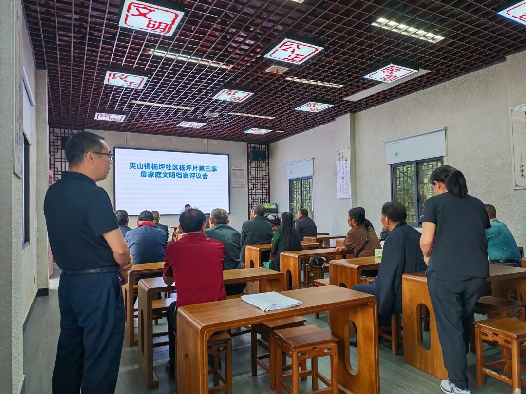 夹山镇杨坪社区杨坪片区第三季度家庭文明档案评议会现场