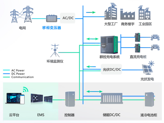 针对传统微电网系统中存在的多次逆变效率低下、设备投入成本高、安装复杂等痛点,泰永长征依托其在电力电子领域的技术积累,推出了创新性的基于移相变压器的微电网解决方案。该方案采用泰永长征ZSSC12系列移相变压器代替传统变压器,在提升电源稳定性和可靠性的基础上,将交流配电直接转换为高效的直流配电,不仅简化了配电系统,还能更方便地直接接入到光伏、储能及直流充电系统,降低了系统设备的投入成本,提高了系统的运行效率。