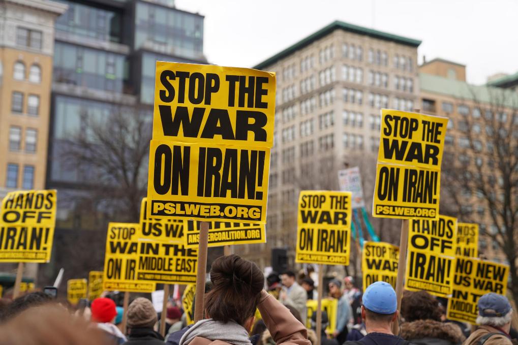 3月7日,人们在美国纽约参加集会游行,抗议美国和以色列对伊朗发动军事打击。新华社记者张凤国摄
