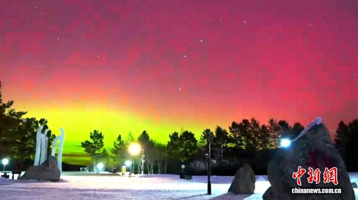受地磁暴影响,20日凌晨,“神州北极”黑龙江省大兴安岭漠河市再次出现红绿极光美景,吸引大批游客踏雪追光。