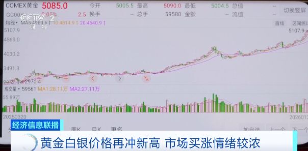 截至北京时间今天下午三点,纽约COMEX黄金期货报约5085美元/盎司,较前一交易日收盘的5004.8美元/盎司继续上涨;COMEX白银报约110美元/盎司,同样较前一交易日收盘价继续上涨。今年以来,国际黄金期货价格涨幅已超17%,白银涨幅则高达55%。