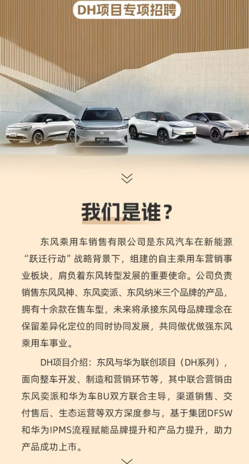 作为东风与华为联合创立的重点项目,DH项目自启动以来持续引发行业关注。从本次DH项目的招聘岗位设置来看,主要面向用户关系部、销售部、渠道发展部等领域广纳贤才,直指终端市场建设,清晰传递出该项目已从技术研发阶段转入商业化落地冲刺期的信号。
