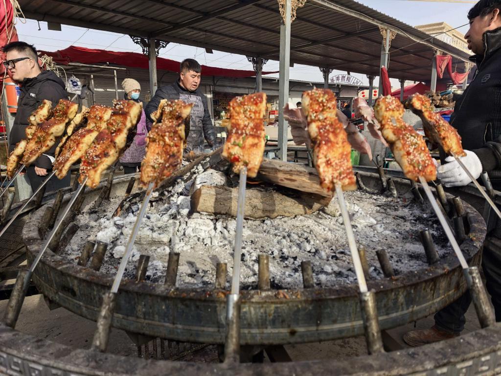 “来!朋友,尝尝烤鱼!”每周日开市的喀什牛羊大巴扎人声鼎沸。美食区里炭火正旺,烧烤的香气肆意撩动着往来游客的味蕾;牲畜交易区,吸引了更多好奇的游客,他们在当地人握手成交与乡音俚语中,触摸到那份延续已久的乡土脉搏。