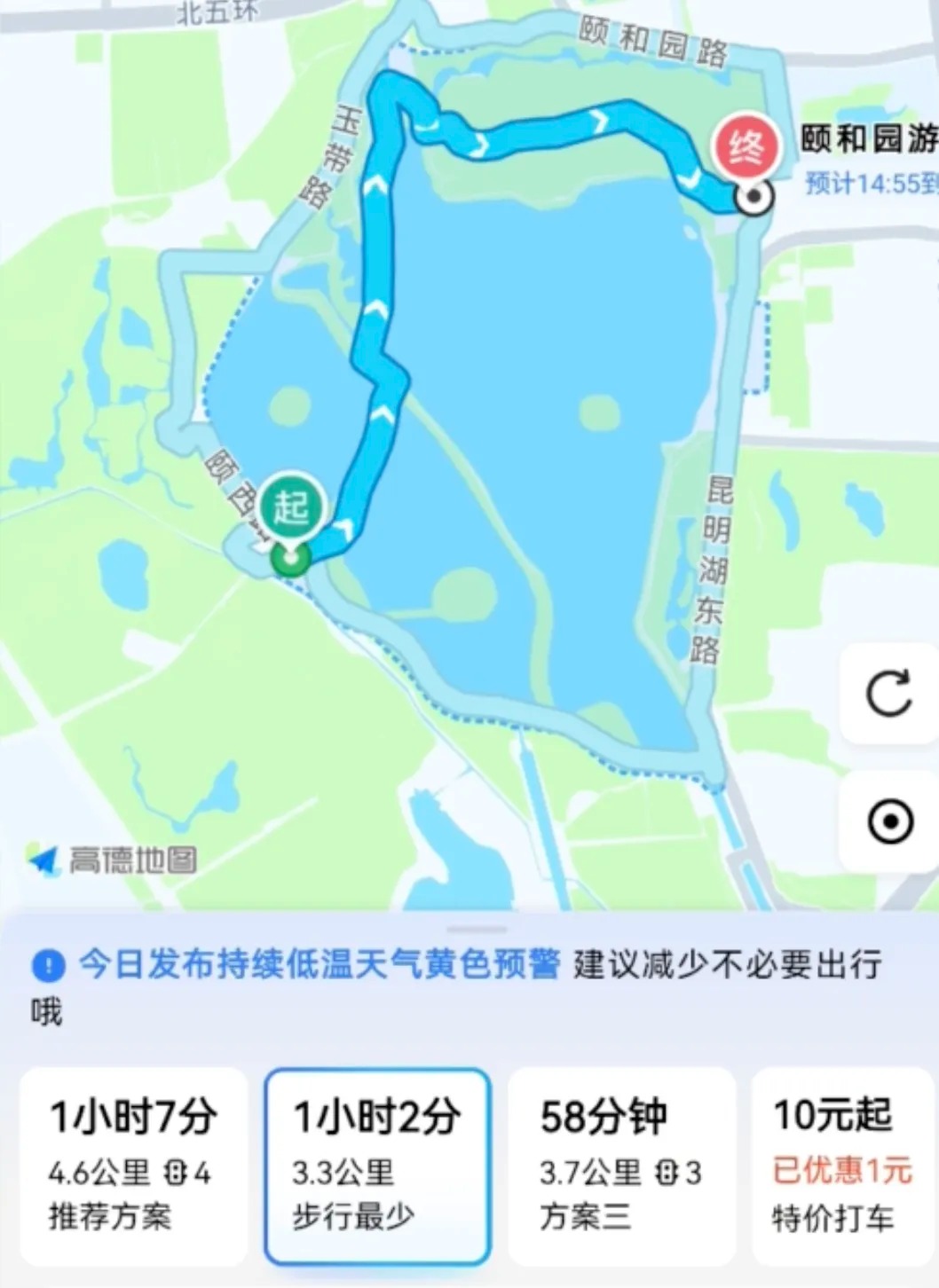 于是,记者从东宫门出闸机,找到游客服务中心。现场工作人员确认,整个颐和园仅在此处设有独立母婴室,园内只有第三卫生间。难道从西门进入的游客也只能兜一大圈来这个母婴室?工作人员面露难色,“如果从西门进,那太远了,几乎要穿整个颐和园过来。”导航显示,从颐和园西门到东宫门外的游客服务中心,最短步行路线也超过3公里。由于该路线要走西堤,经过多座桥,步行预估需要45分钟到1小时。如果推婴儿车,可能需要更长时间。