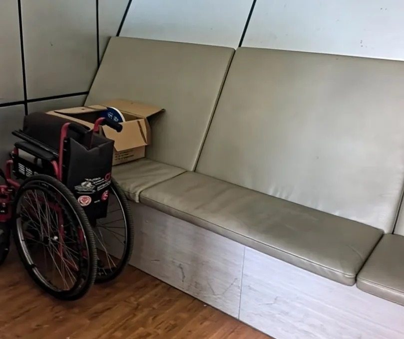 在海淀公园,游客服务站的小门上贴有母婴室的标识。记者尝试打开,发现门已上锁,找到保安帮忙开门后,看到左侧有一面屏风。“这里面没什么设施,只是有个地方能坐。”保安指了指屏风后说,“可以在这儿换尿不湿或者喂奶。”记者在现场看到,所谓的母婴室位于房间一角,里面只有一排又窄又脏的长椅,上面堆放着纸箱等杂物,旁边还有一把轮椅,让本就局促的空间更显拥挤。
