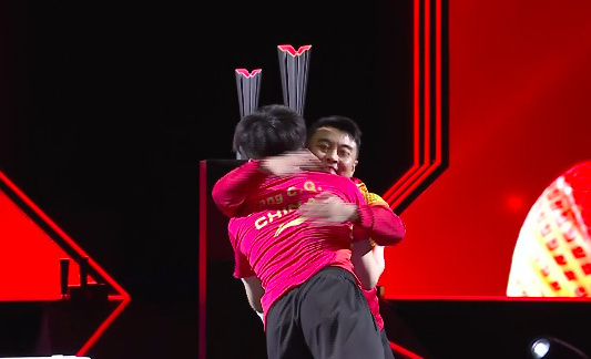 决赛夺冠后,王楚钦奔向自己的教练王浩,拥抱着享受胜利的喜悦。