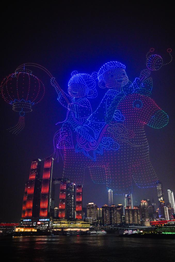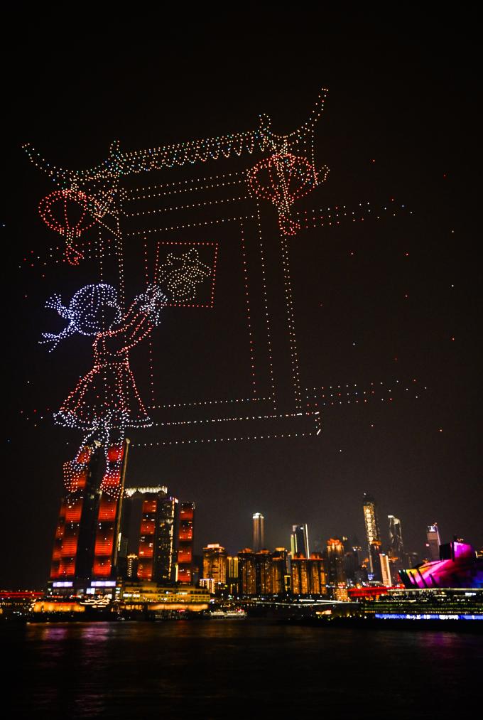 大年初一,“新韵重庆”无人机灯光秀在重庆夜空上演。无人机灯光队列组成各种创意图案,点亮夜空,为观众献上视觉盛宴。