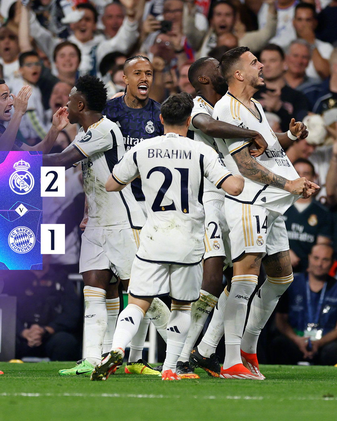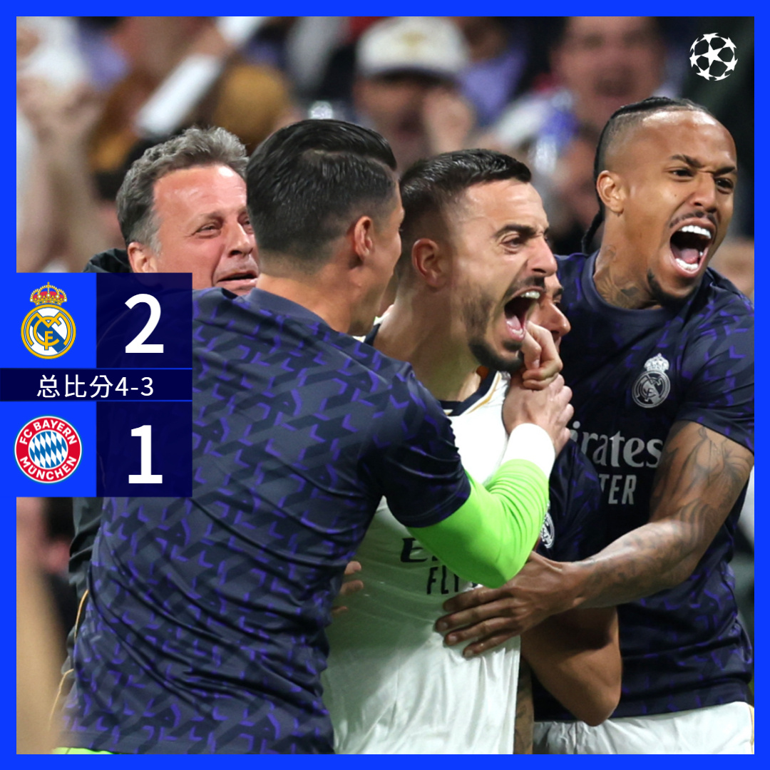 在北京时间9日凌晨进行的2023-24赛季欧洲足球冠军联赛半决赛次回合中,凭借何塞卢的梅开二度,主场作战的皇家马德里2:1逆转绝杀拜仁慕尼黑,并以总比分4:3晋级决赛。