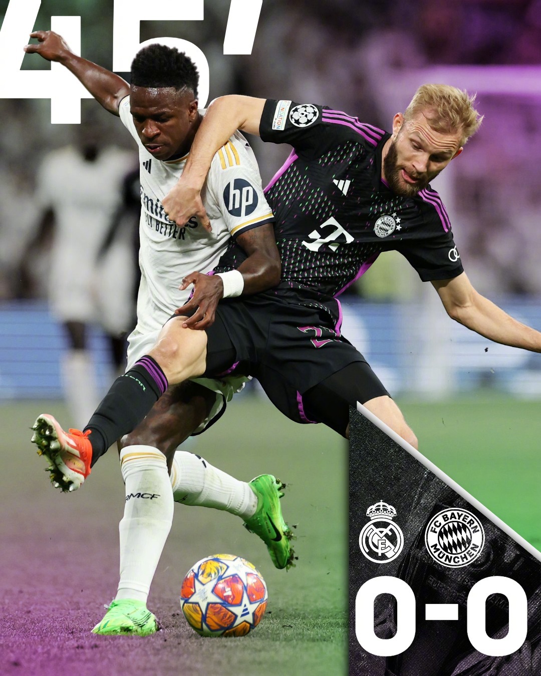 借主场之势,皇家马德里在上半场比赛中创造了更多破门机会,但诺伊尔屡次化解险情,至中场时比分仍是0:0。