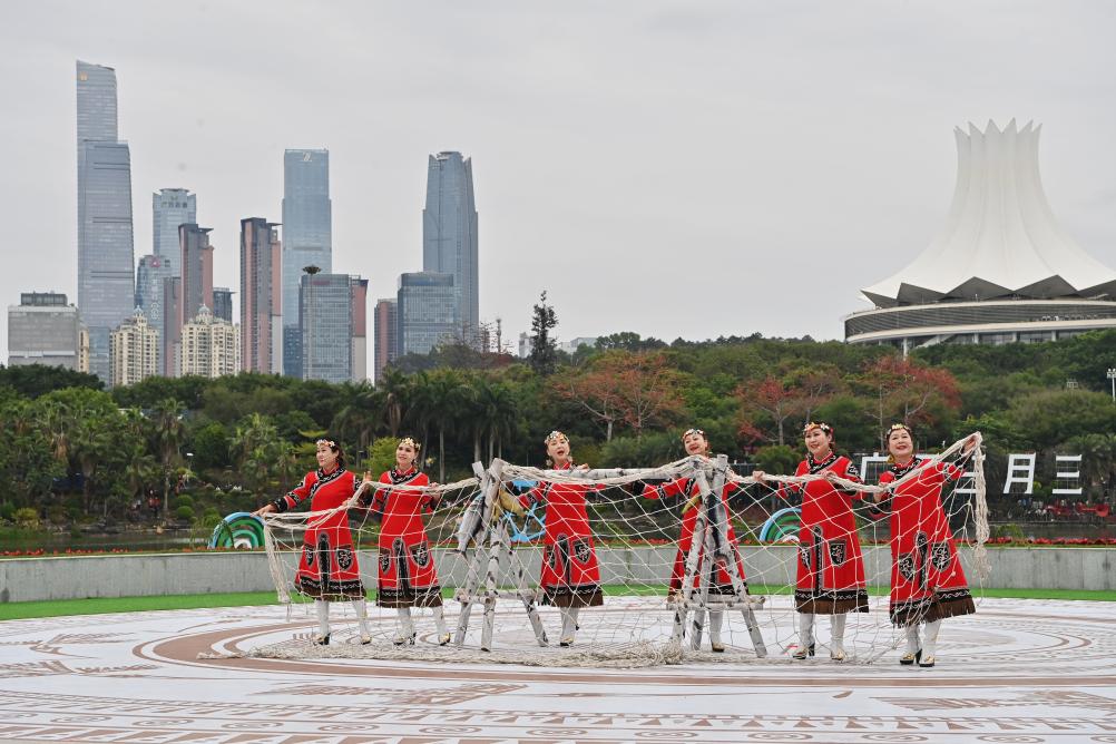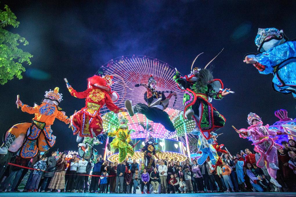 2026年2月19日,英歌舞队在广东省佛山市高明区滨荷Park生态文创园街头巡游表演。 文物保护利用和文化遗产保护传承全面加强