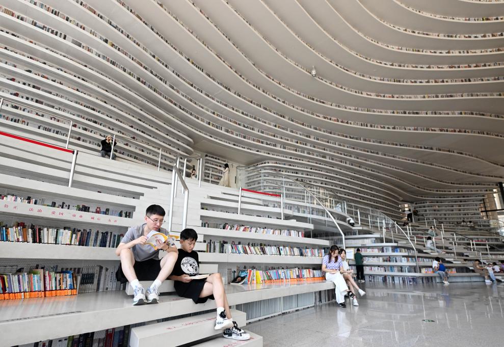这是中国国家版本馆中央总馆(2022年7月30日摄,无人机照片)。 2025年9月11日,在西藏拉萨市实验小学,孩子们在弹奏扎念琴间隙休息。2014年,“扎念琴制作技艺”入选第四批国家级非物质文化遗产代表性项目名录。 2024年8月27日,市民在天津滨海新区图书馆内阅读。有着“滨海之眼”之称的滨海新区图书馆位于天津滨海文化中心,目前已成为天津滨海新区的文化“新地标”。 2025年9月29日,“百年守护——从紫禁城到故宫博物院”展览开幕式在北京故宫博物院举行,观众参观青铜莲鹤方壶。2025年是故宫博物院建院100周年。 2025年,全国规模以上文化及相关产业企业