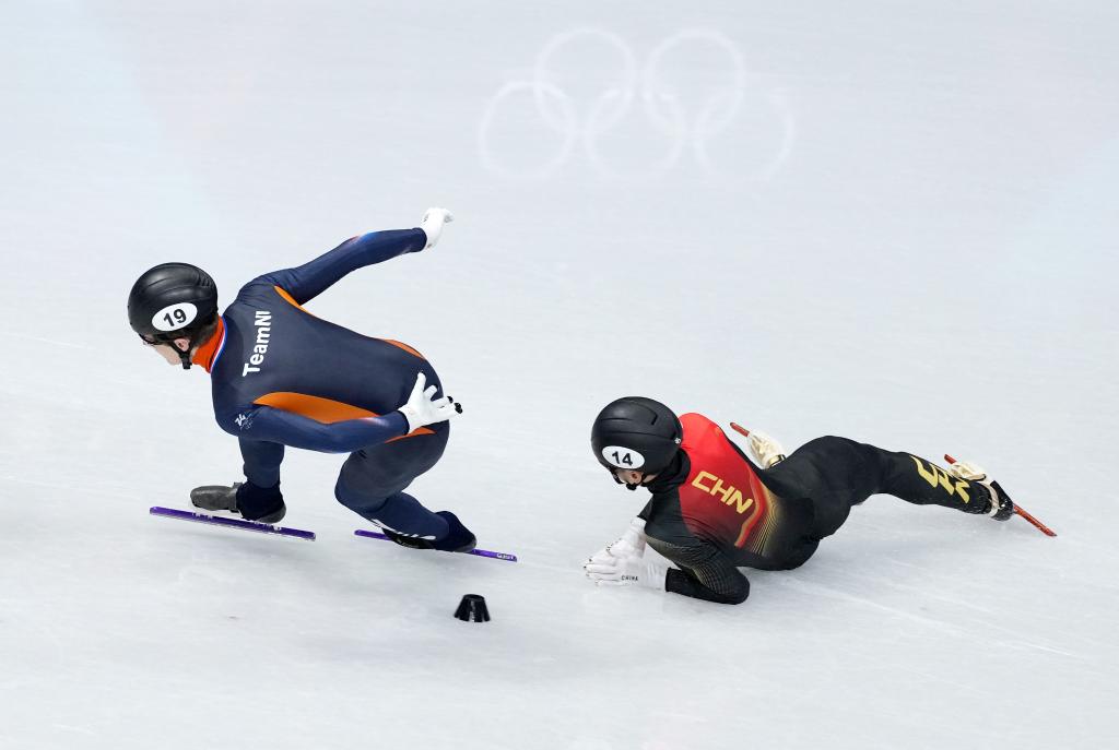 2月18日,刘少昂(右)在短道速滑男子500米半决赛中摔倒。新华社记者 薛宇舸 摄