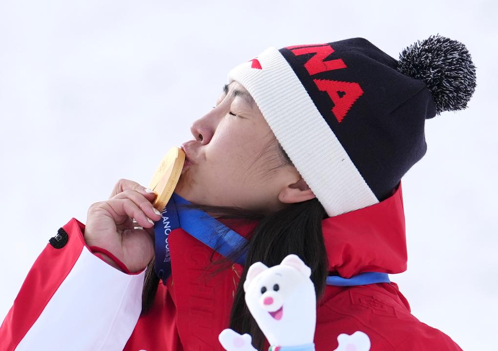 2月18日,冠军中国选手徐梦桃在自由式滑雪女子空中技巧颁奖仪式上亲吻金牌。新华社记者 胡超 摄