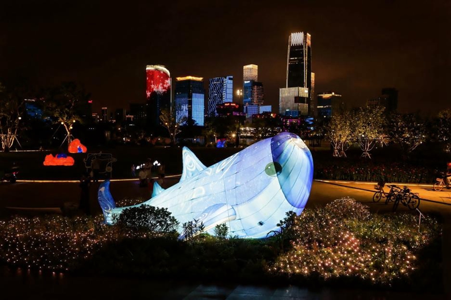 “星鱼奇缘”系列主题光影装置在前滩滨水区点亮。新华网 发(受访者供图)
