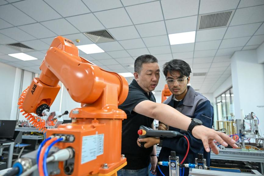 2025年6月16日,在天津现代职业技术学院鲁班工坊实训教室,巴基斯坦留学生木衫(右)在老师指导下操作自动化设备。(新华社记者 孙凡越 摄)
