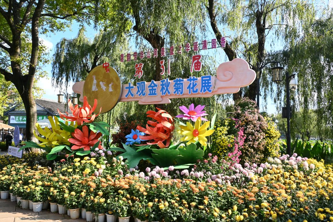 与此同时,昆明大观楼菊花展热闹非凡。10月1日至11月16日,第31届大观金秋菊花展在大观楼举行。据了解,本届菊花展以“菊韵芳华山河美 盛世华诞满园香”为主题,300多个品种,万余盆菊花惊艳亮相。现场草坪花架上的悬崖菊,形成了一道绚丽夺目的“菊花瀑布”;催耕馆内集中展示12盆菊花盆景,融合大型树桩、丛林式等多种盆景类型,展现菊花栽培与艺术创作的融合;圆形睡莲池周边环绕多个菊花立体造型柱,池水倒映花姿,别具观赏韵味。这个10月,大观楼正以丰富的菊花品种、多样的菊花造型与浓厚的文化氛围,为省内外游客带来一场兼具视觉享受与文化体验的秋日赏菊盛宴。“第一次见这么多菊花,除了常见的品种外,还看到了绿萍、绿沙等稀有绿色菊品种,而且拍照特别出片。”来自成都的游客陈晨说。