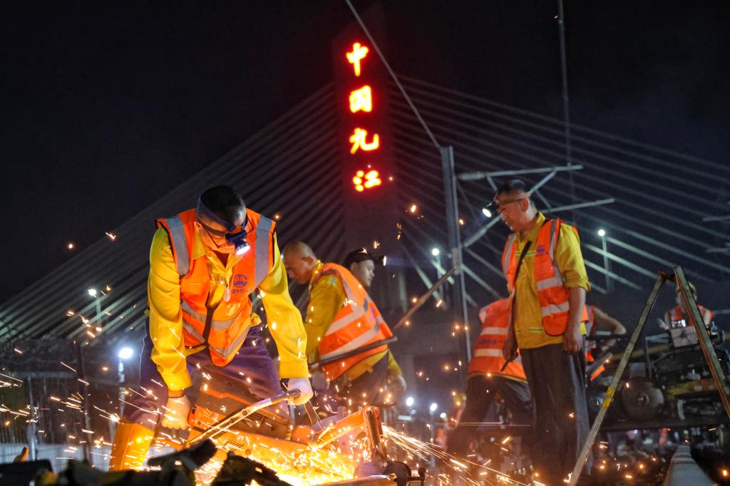 庐山站共有三个场,分别为客专场、城际场、普速场。庐山城际场是既有昌九城际铁路的关键运输要塞,高峰期每3分钟就有一趟列车通过。铁路部门提前调整运输方案、优化列车运行时刻,从9月16日凌晨开始,安排4个施工天窗点,累计进行22个小时的Ⅰ级封锁施工,先后更换昌九城际铁路的12组道岔,确保既有线路运输秩序平稳和施工安全两不误,是全线建设过程中等级最高、风险最大、组织最复杂的站改施工。