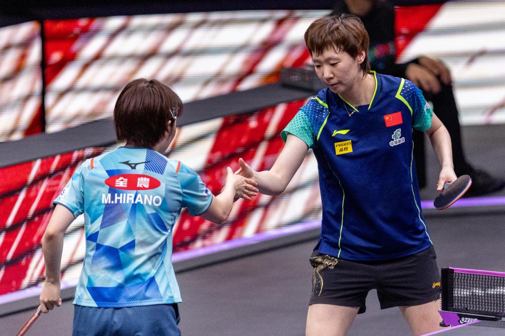 6月1日,王曼昱(右)在比赛结束后与平野美宇握手。