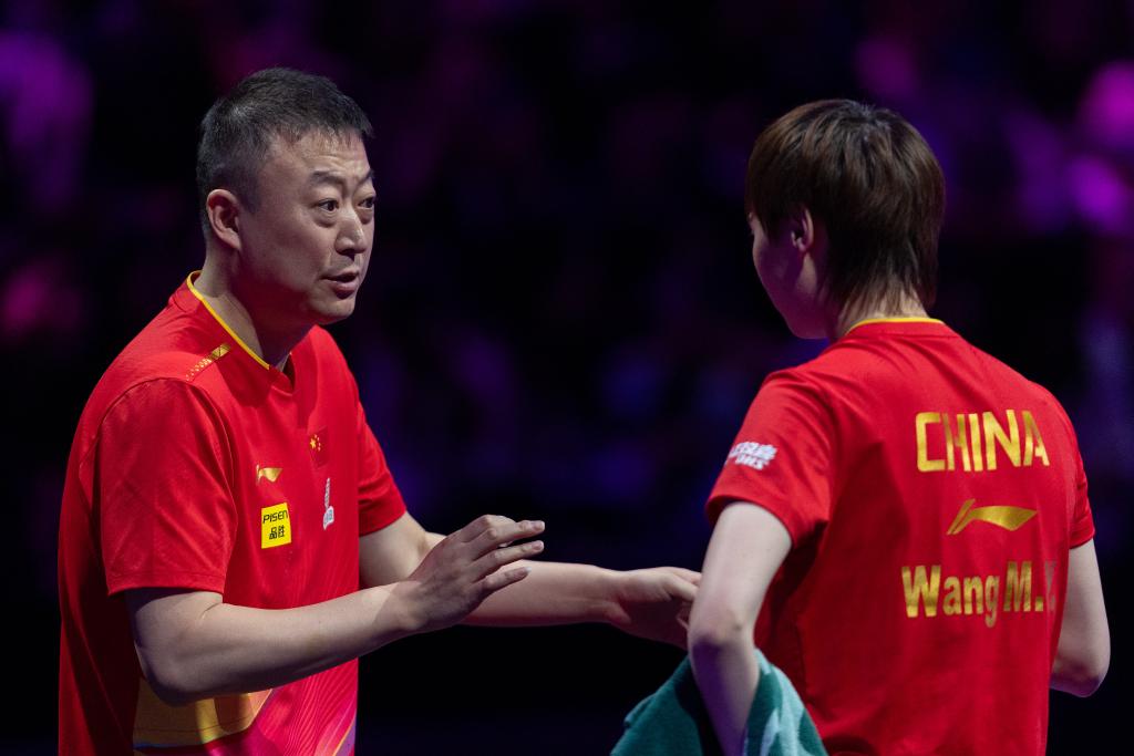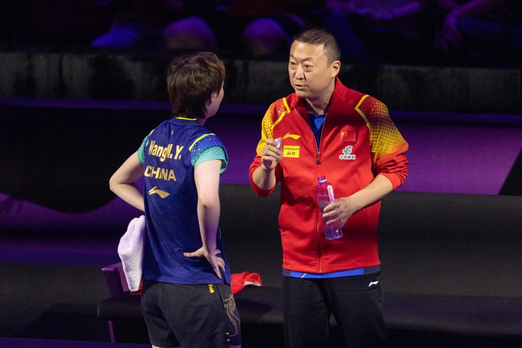 6月1日,教练马琳(右)在比赛间隙与王曼昱交流。