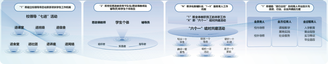 (三)专业导师精准滴灌,构建系统成长支持体系。学校整合多方资源,组建“校内教师+行业专家”双导师团队,完成思想引导、学业领航、生涯规划与就业指导等,实现“五育并举”。校内教师开展“六个一”结对行动,帮扶一个学生、联系一个宿舍、带好一个社团、做好一堂报告、组织一项活动、走访一个家庭,实现师生结对全覆盖。