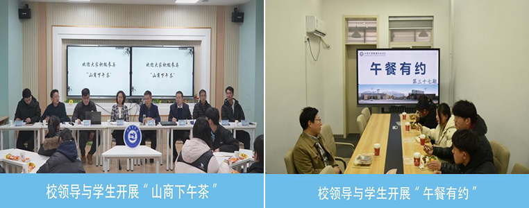 (一)领导干部下沉社区,零距离传递暖心力量。学校全面落实《关于建立领导干部联系学生工作的实施细则》,领导干部带头践行“一线规则”,深入社区开展“七进”活动,进宿舍、进讲座、进网络、进社团、进食堂、进课堂、进班级,共助学生成长。学校打造品牌活动,秉持“及时解决,有效沟通”原则,搭建“山商下午茶”“午餐有约”面对面交流平台,实现师生“双向预约”模式,成功开展63期,累计服务1260名学生。