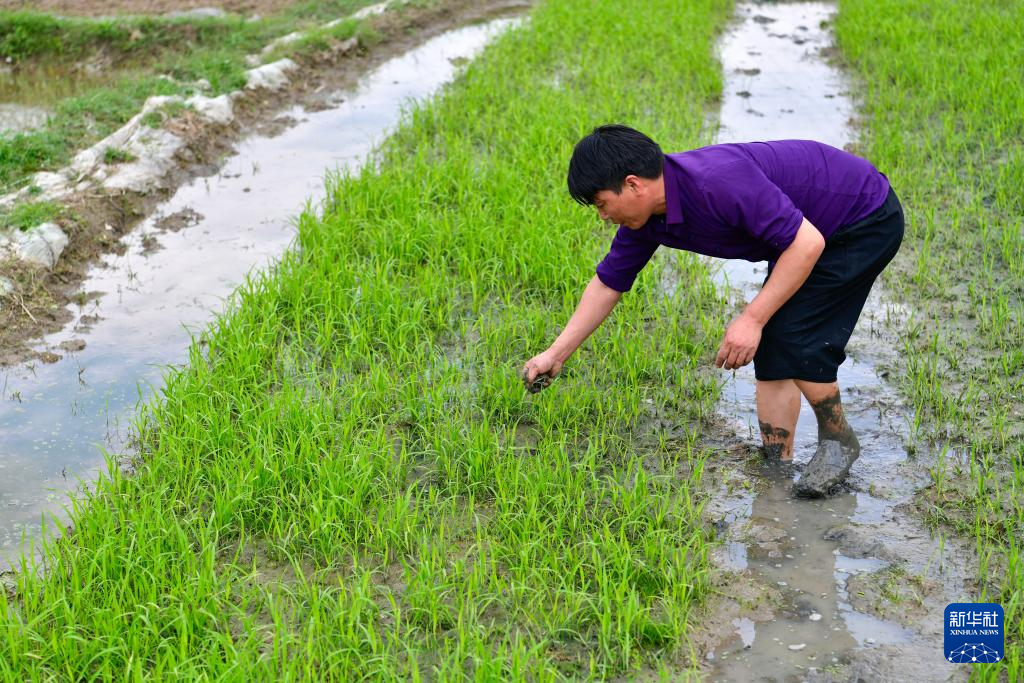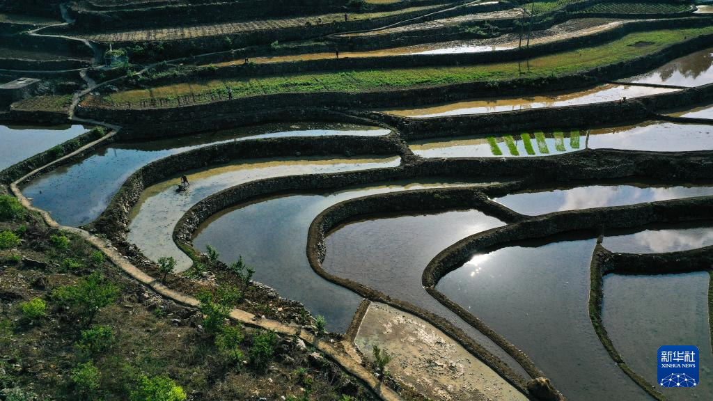 4月24日,贵州省毕节市七星关区生机镇镰刀湾村村民在绝壁天渠灌溉的稻田里劳作。