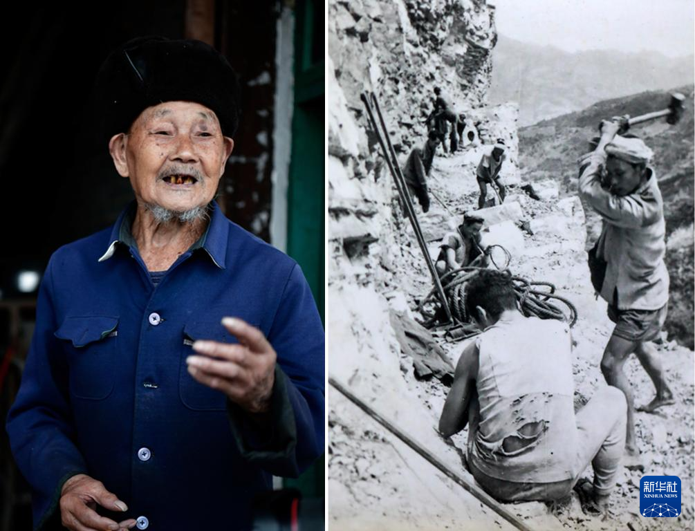 拼版照片:左图为4月24日,修渠人刘新芝在介绍当年修建七星关区生机镇高流天渠的情况(新华社记者 杨文斌 摄);右图为1960年,刘新芝(右一)与村民们在修凿七星关区生机镇高流天渠的情景(王振翔摄)。