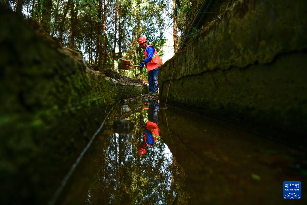 护渠队员们在贵州省毕节市七星关区生机镇清理高流天渠旁的落叶与碎石,防止这些杂物堵塞沟渠(4月24日,无人机照片)。