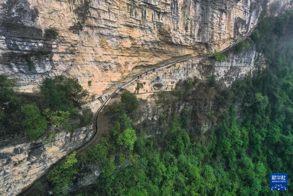 护渠队员们在贵州省毕节市七星关区生机镇巡护高流天渠途中(4月24日摄,无人机照片)。