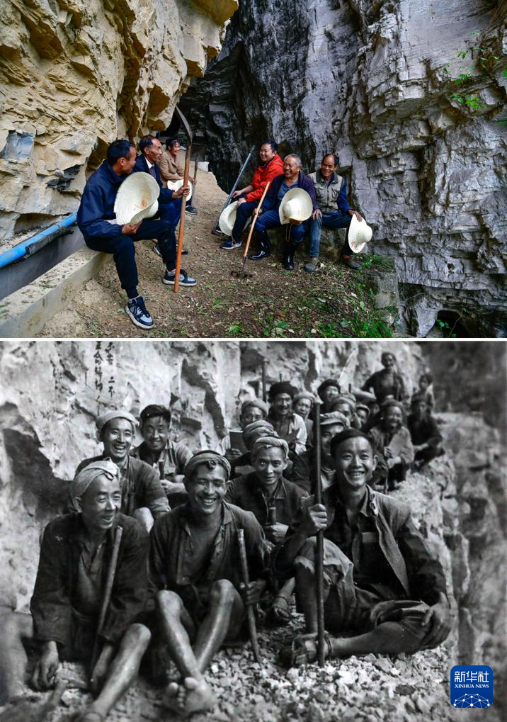 拼版照片:上图为4月24日,护渠队员在贵州省毕节市七星关区生机镇巡护高流天渠时留影(新华社记者 杨文斌 摄);下图为1960年,村民们在七星关区生机镇修凿绝壁天渠时的合影(王振翔 摄)。