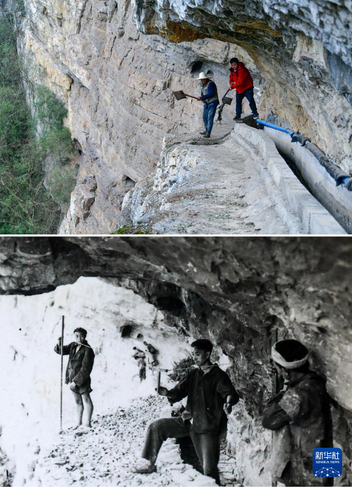 拼版照片:上图为4月24日,护渠队员在贵州省毕节市七星关区生机镇高流天渠清理渠道(新华社记者 杨文斌 摄);下图为1960年,村民在七星关区生机镇修凿高流天渠时的情景(王振翔摄)。
