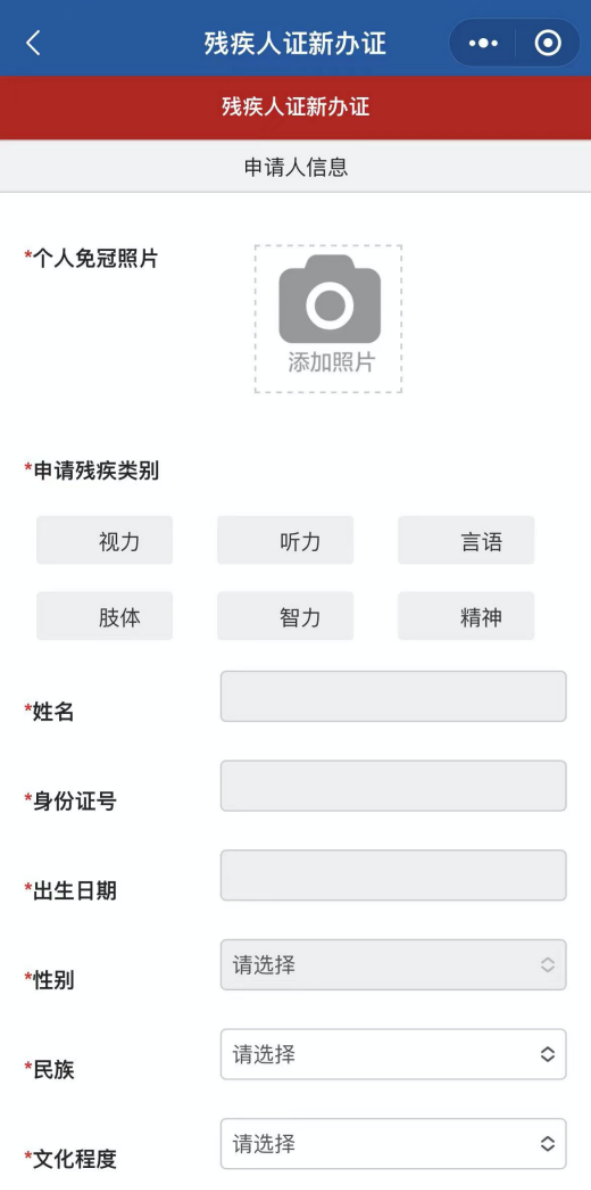 以“残疾人证件申请”为例,只需上传照片、选择残疾类别、完善个人信息,就能完成申请。